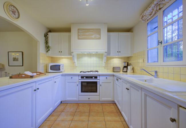 3 Bedroom Townhouse, 120 sqm in 1 level, maximum 6 persons, very comfortable and pleasant furnishing : entrance, separate toilet, separate shower, large living/dining room with TV, fully equipped kitchen with dishwasher, washing machine with dryer, fridge/freezer, oven, microwave, 4 hobs, kettle, filter coffee machine, toaster. 1 bedroom with 2 small (or 1 double) beds, shower, bath and toilet, 2 bedrooms with 2 small beds (or double beds). Air conditioned bedrooms. Outdoor furniture (table, chairs and sunbeds). Parking place/garage close to the house. This house is situated near the hamlet pool. Garden and terrace, facing south and west. ANIMALS PROHIBITED