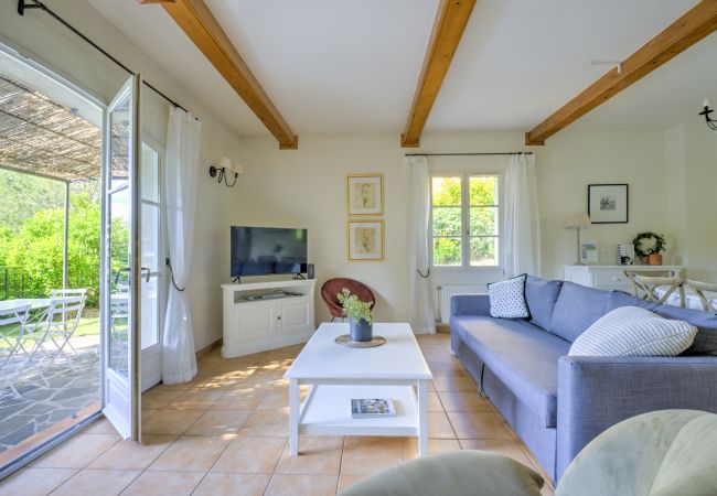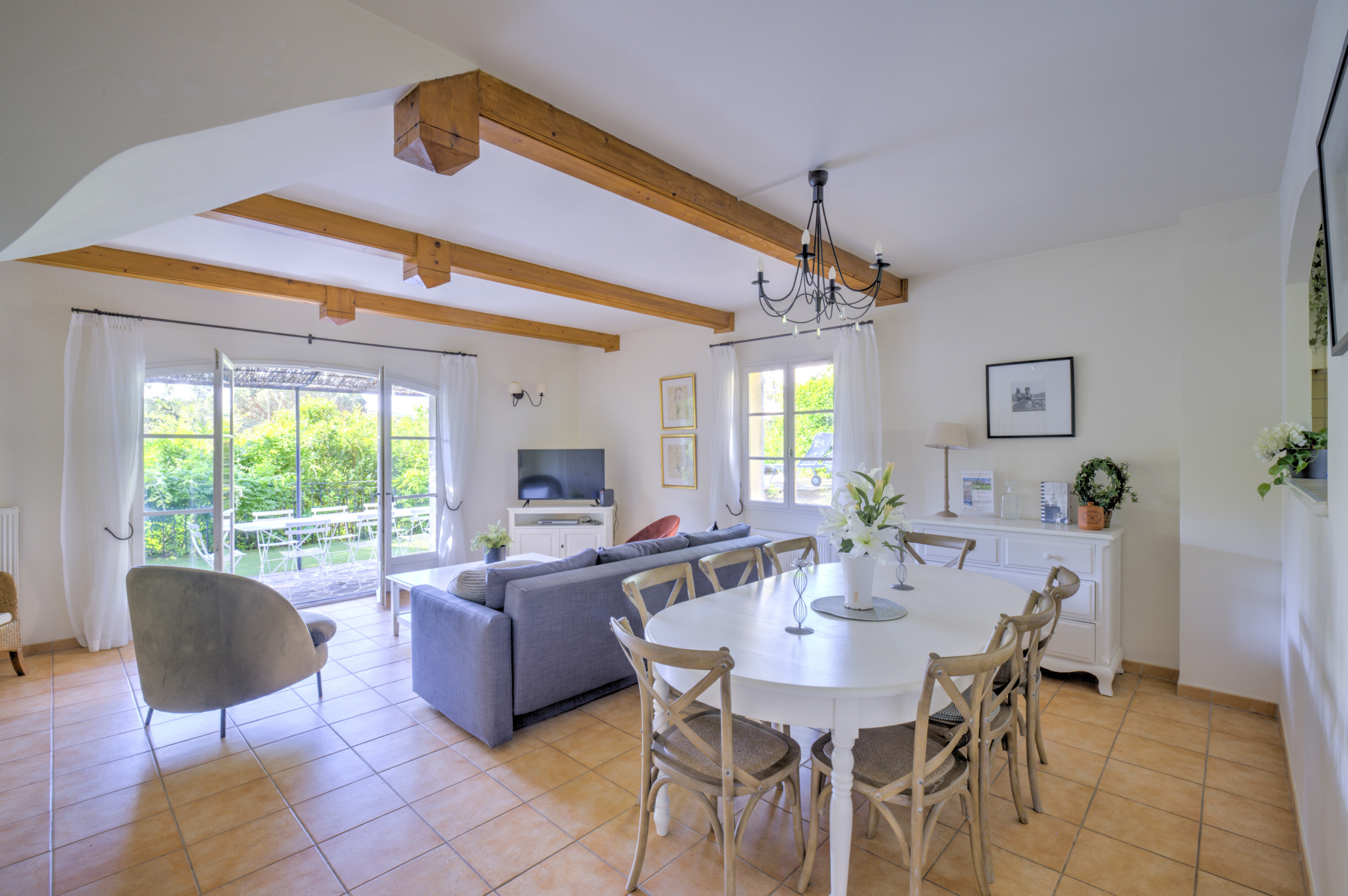 Terrasse, jardinet, mobilier extérieur (table, chaises, chaises longues). Garage ou parking près de la maison. Climatisation dans les chambres.